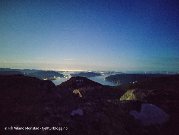 Natt og opplyst bebyggelse der nede. Stavanger i det fjerne.