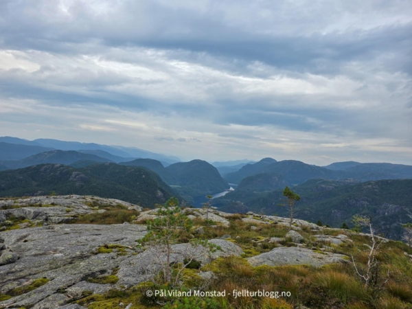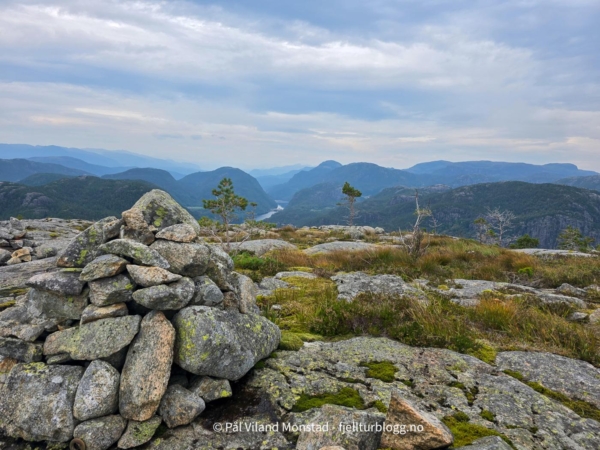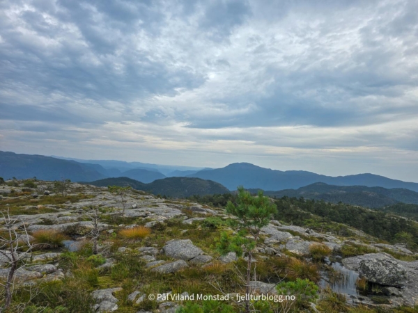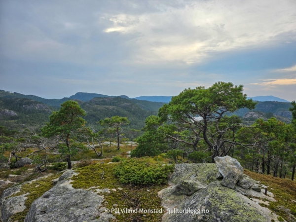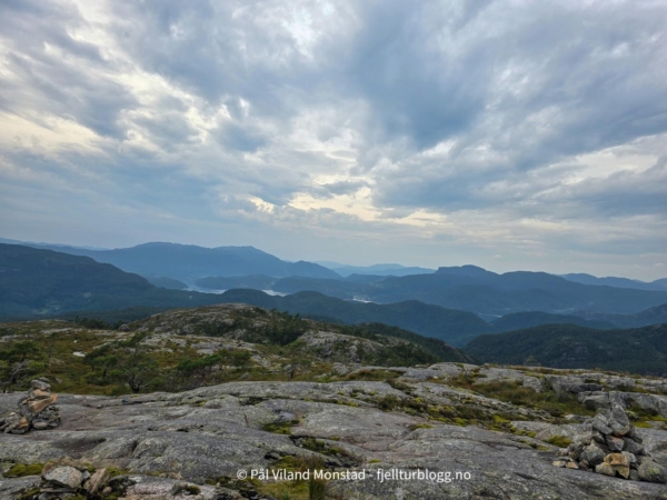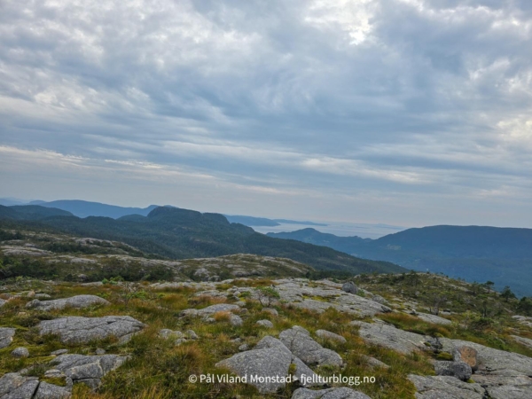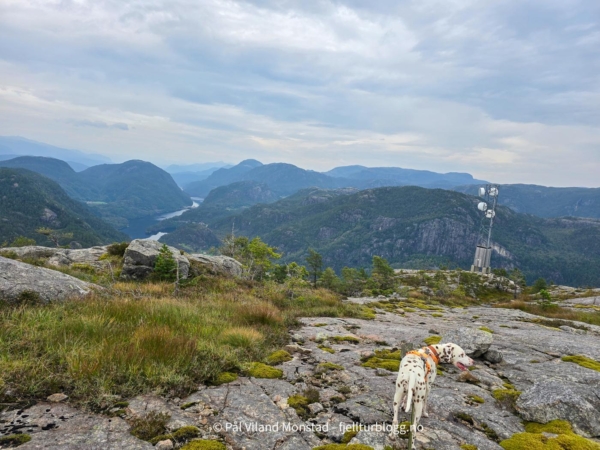 Masta som er godt synlig fra veien står helt øst på heia. Utsikt mot Lovravatnet og Lovraeidet.