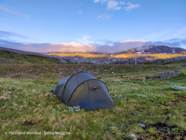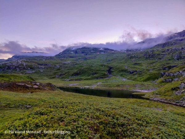 Storfe på fjellbeite gjorde at jeg måtte langt inn for å finne teltplass. Nedenfor Finnabuvatnet.
