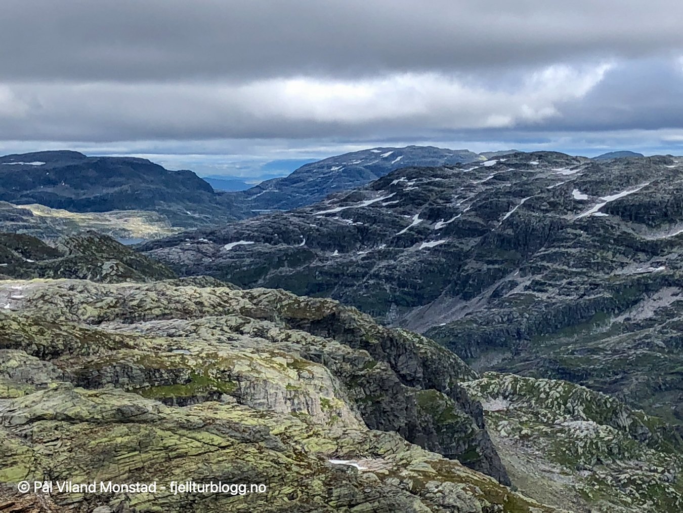 Utsikt fra toppen mot øst. De to høyeste toppene i Rogaland. Kistenuten til venstre og Vassdalseggi til høyre.