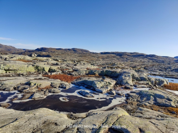 Fra Skorpa gikk turen i nordvestlig retning. Vi runda topp 1217 på nordsiden, og fortsatte vestlig mot Krossvasskilane, der vi hadde forlatt T-stien tidligere på dagen. Det ble et bratt og kronglete parti ned et skar før vi kom inn på stien, men heller ikke her kunne islagte steiner stoppe turfølget.
