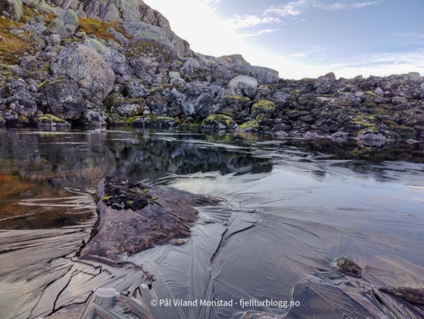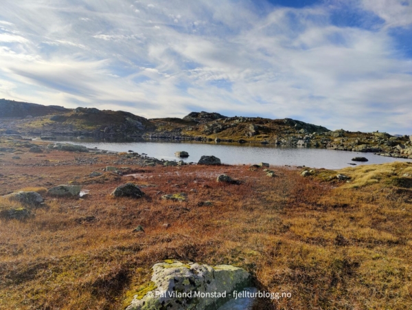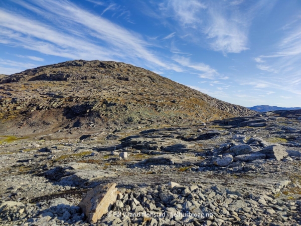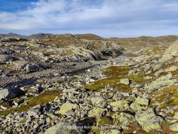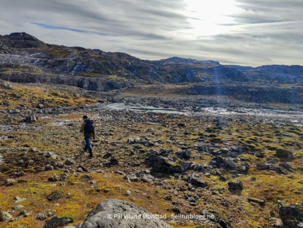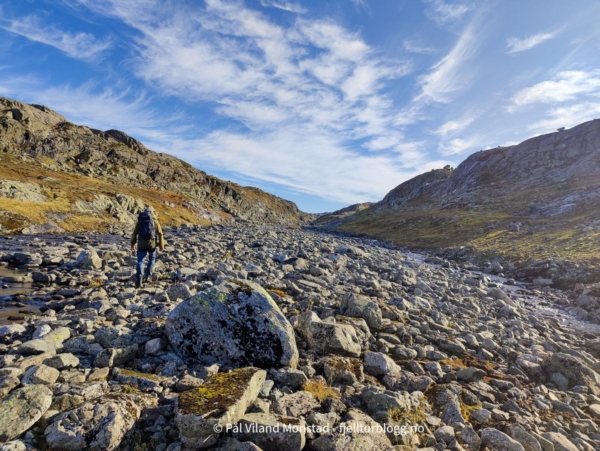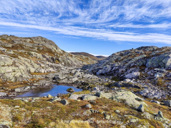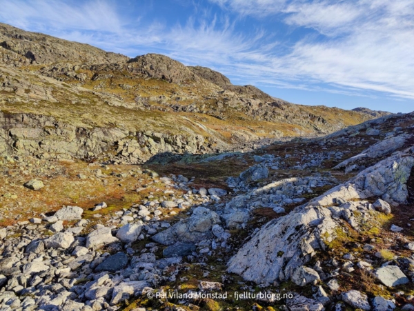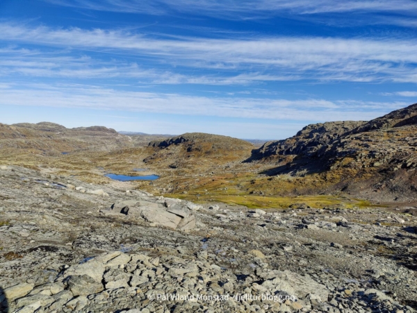 Det vil si, den er nok godt merka inn til hytta på Grjotdalsneset, men vi mista nødlingene flere strekker på turen inn mot Grjotdalen. Vi fulgte ruta som var tegnet inn på karet, men nødlingene var lette å miste. På nordsiden av elva i Grjotdalen traff vi på nødlingene igjen, og det var lett å følge de innover dalen. Før skaret ved topp 1220 tok vi nordlig retning. Noe ur, men ellers ganske lett å gå oppover, uten veldig mye stigning.