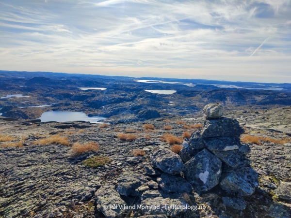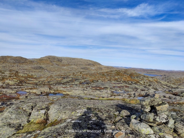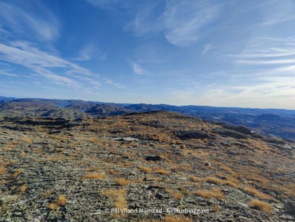 Øverst i skaret dreide vi mer østlig for å komme opp på platået. Noen korte og bratte kneiker, men ellers lett å gå og finne fram. Nord for topp 1357 var det fin utsikt nedeover dalen mot Austra Laupet. Vi måtte passere en liten dal, før det gikk ganske bratt opp mot topp-platået. Det høyeste punktet lå lenger nordvest enn varden, men vi var innom begge punketer. Fra Grønafjellet var det fantastisk utsikt over Dyraheio og områdene på østsiden av Blåsjø, innover Bykle.