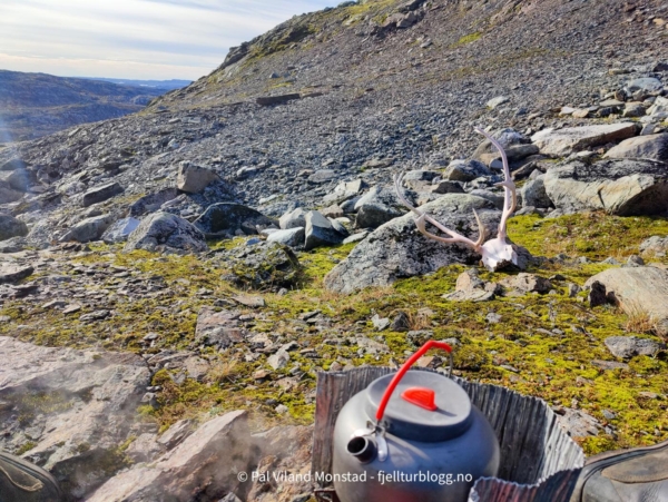 Vi gikk tilbake til skaret mellom topp 1313 og 1357, hvor vi hadde satt sekkene fra oss på vei opp til toppen. Her ble det en god pause med middag ala Real turmat.