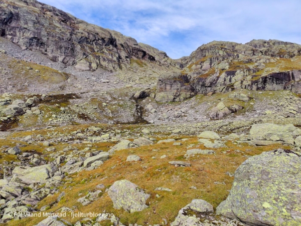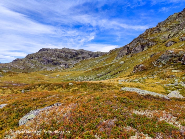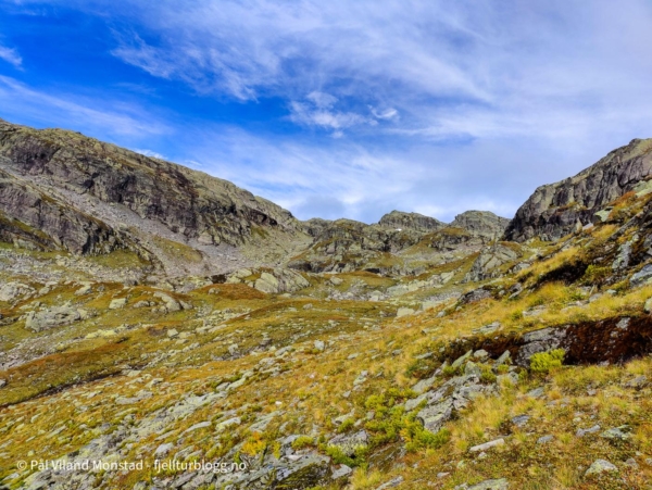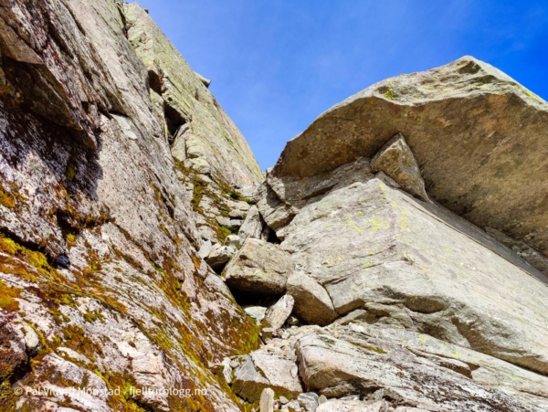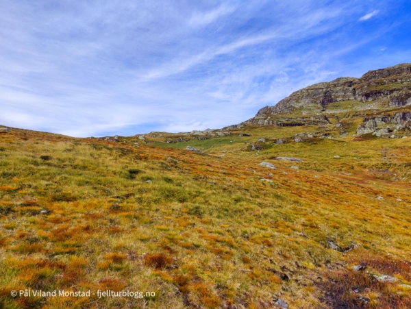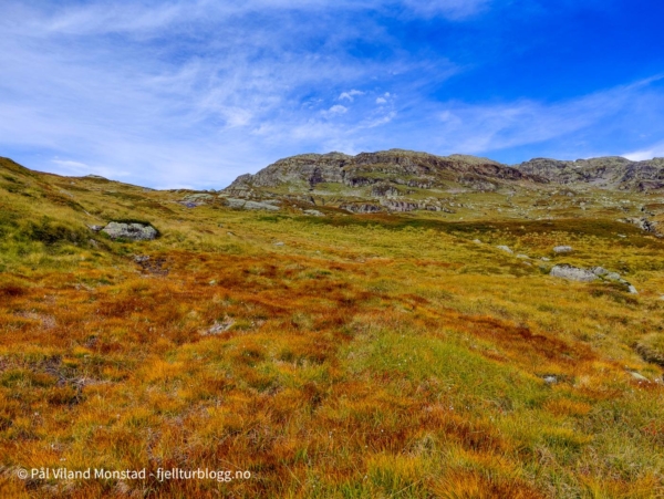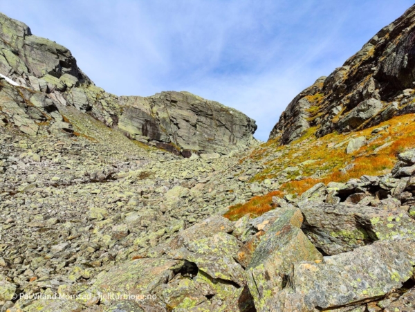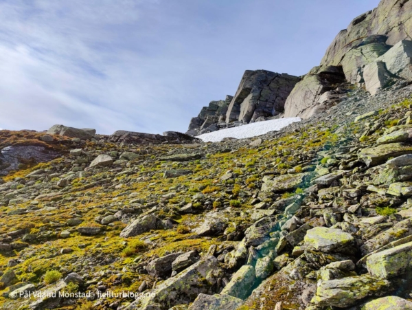 Det var fint å gå i blåbærlyng i passe stigning mot Bestaflåtane. Fortsatt mye bær, så det gikk litt trått i starten. Absolutt greit med litt påfyll og bær, siden frokosten flere timer tidligere for lengst var oppbrukt. Etter å ha passert det ganske flate partiet over Bestaflåtane var det kryssing av et par mindre tvergående smådaler, før jeg kom innover mot Storaskar. Her var lyngen byttet ut med stein i mange størrelser. Ikke særlig utfordrende ur, og partier med grasmark innimellom. Nesten øverst i skaret tok jeg til venstre opp ei slak renne med fonn. Fonna ble passert, og jeg tok en snarvei (tror jeg) opp ei svært bratt, men kort, renne. Etter litt klyving var det greit å gå siste stykket i steinlandskapet mot toppen, som etter hvert kom til syne.