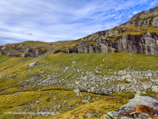 Jeg tok en litt annen rute på returen, uten at det nødvendigvis var til det bedre. Jeg måtte gå langs en lang skrent, og endte opp øverst i skaret jeg kom opp. Svært bratt å komme ned helt øverst, men ikke lange stykket. Deretter gikk jeg stort sett samme rute som opp.