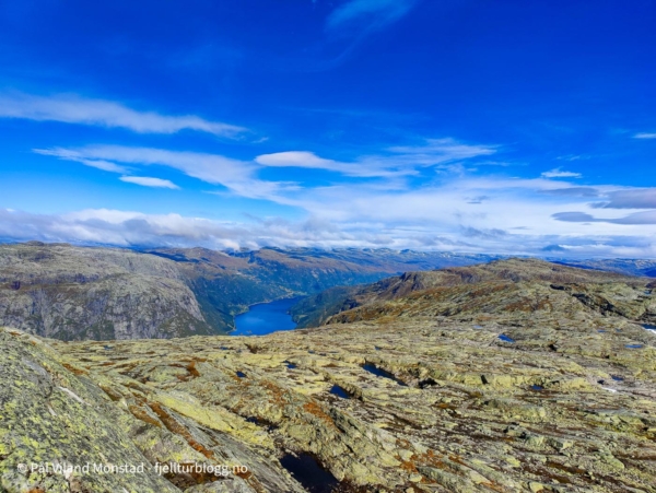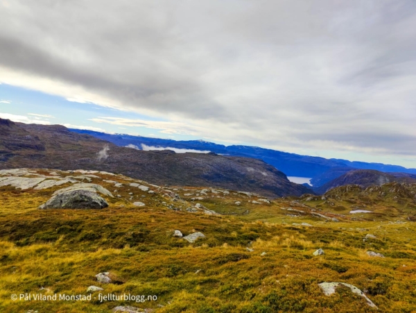 Flott utsikt mot Røldalsvatnet og Hordadalen. Sørover var det lett å få øye på Snønuten og Kyrkjesteinskaret.