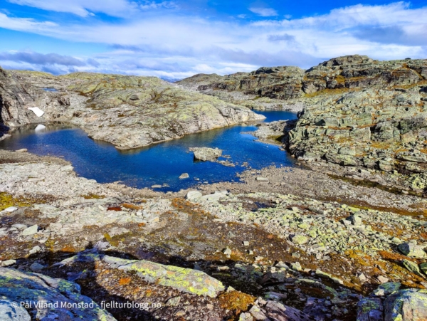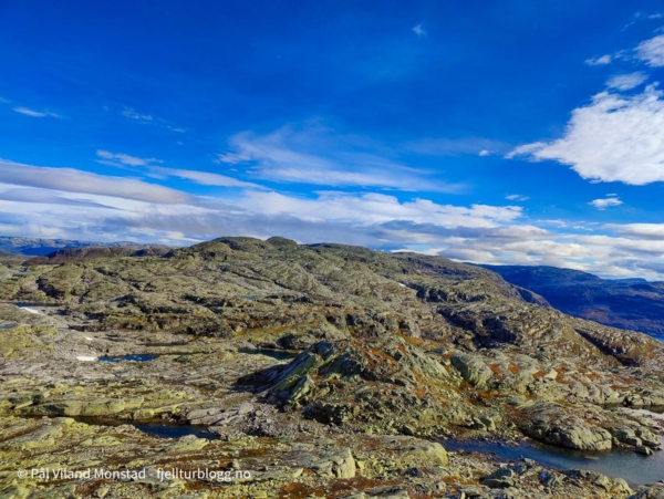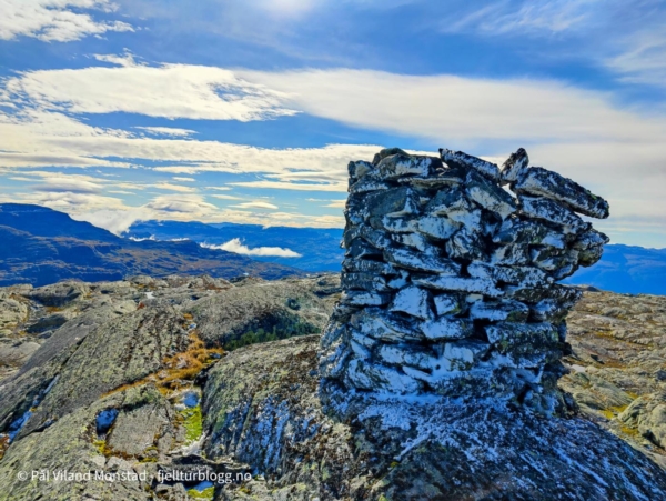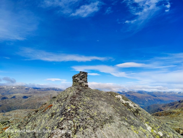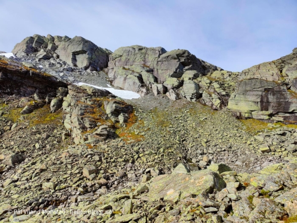 Fonna jeg hadde passert hadde et fint lag med nysnø. Flere steder i mosen var det også rester etter snø. Vel oppe ved den flotte varden på toppen, 1492 moh, var det skikkelig «drevsnø» på nordsiden av varden. Ingen tvil om hvilken retning vinden og snøen hadde kommet fra.