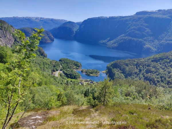 Vel oppe ved den store varden på toppen ,var det fin utsikt vestover mot ytre del av Sandsfjorden. I øst tronet Mælen, og i nord Skaulen. Videre vestover på nordsiden av Hylsfjorden lå flere Sauda-topper delvis dekket av snø: Avhoggsnuten og Bjørnaskornuten, og enda lenger vest Kjeringnuten , Skorvenuten og Vardanuten.