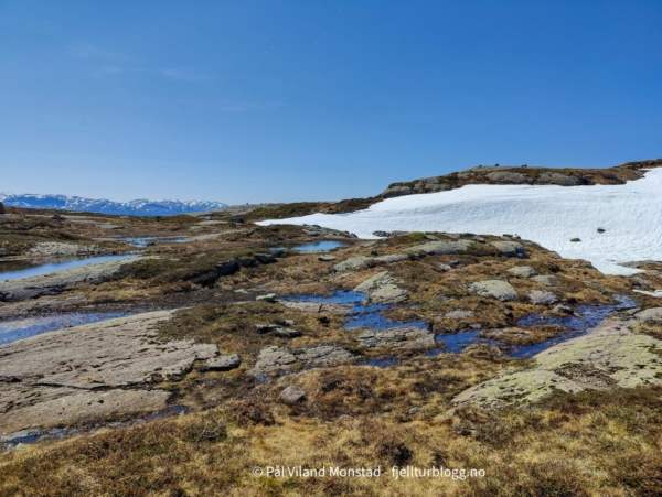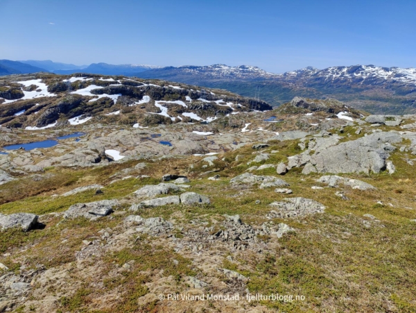 Etter på ha passert noen fjellskrenter var det lett å komme videre opp til Hestfjellet, 933 moh. Det var fortsatt noen snøfonner å gå over, men snøen var fast og fin, og lett å gå på.