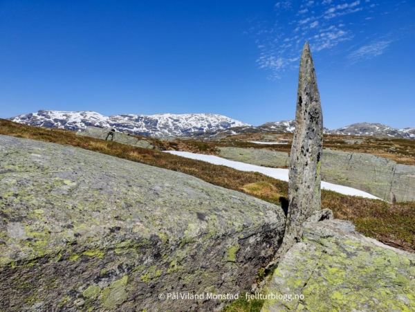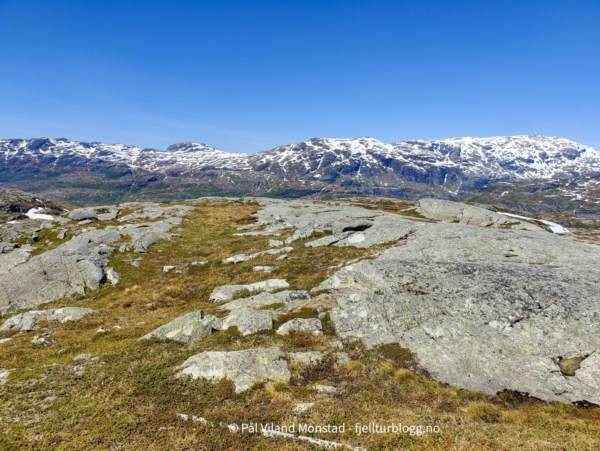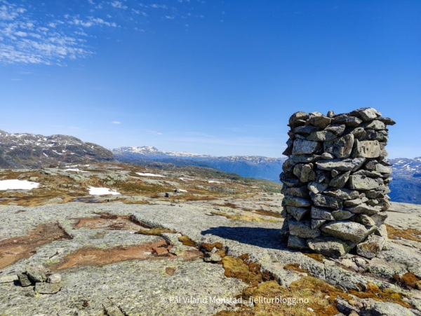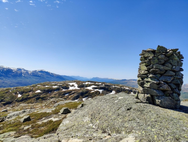 Etter hvert flatet det ut innover mot Liastølen, før det var ny stigning opp mot Hellestølen. Stien var ikke fullt så tydelig og mye brukt videre fra Liastølen, men likevel var det lett å følge den. Ved Hellestølen tok stien slutt, og jeg fortsatte i mer lettgått terreng videre vestover mot Sletthei. Jeg tok turen innom en stor og godt synlig varde sør på Sletthei, før det gikk radig over snaufjell i nordvestlig retning.