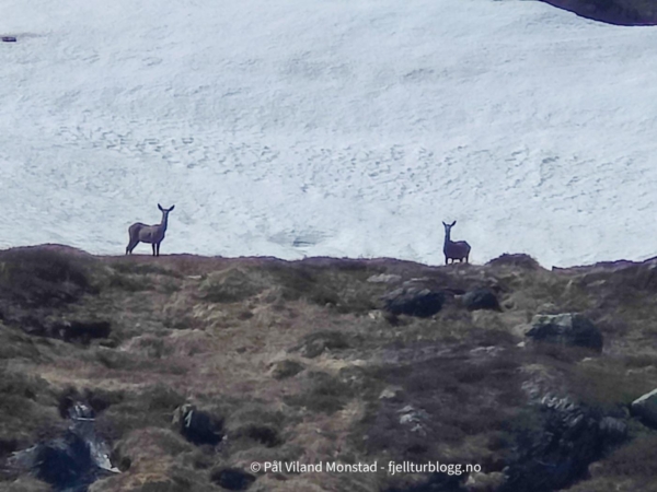 Ved ei slik fonn lå to hjorter. Jeg så hodet på den ene på lang avstand. Etter å ha nærmet meg en god del, reiste to hjorter seg. Jeg hadde vinden imot, og de tok seg god tid før de luntet avgårde.