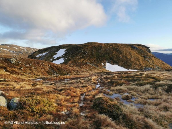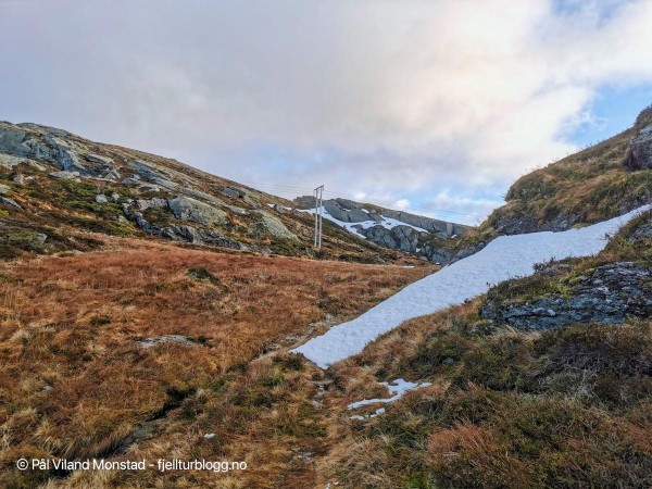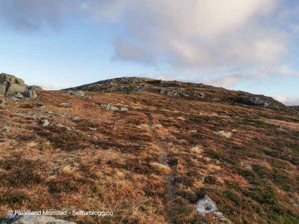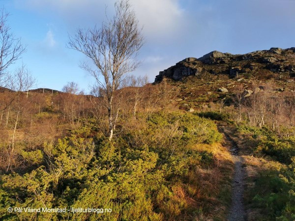 Stien er tydelig i terrenget og sola kommer fram!