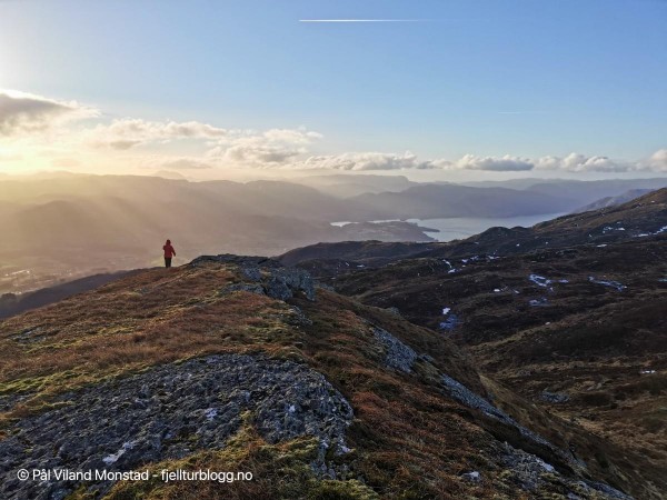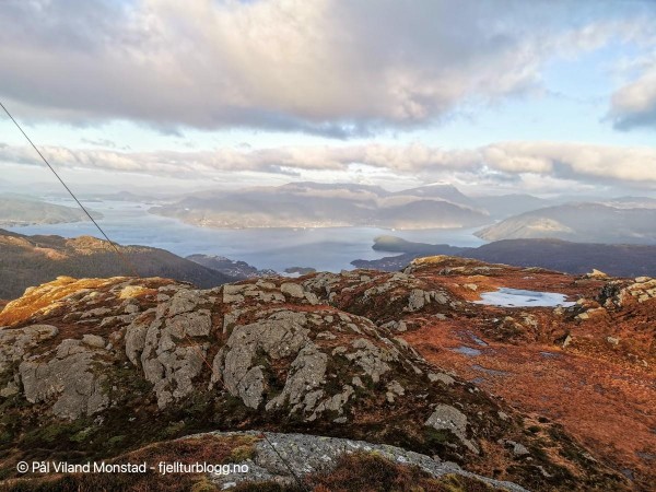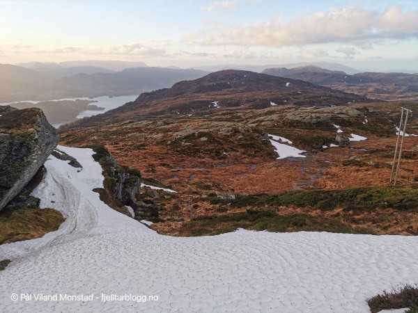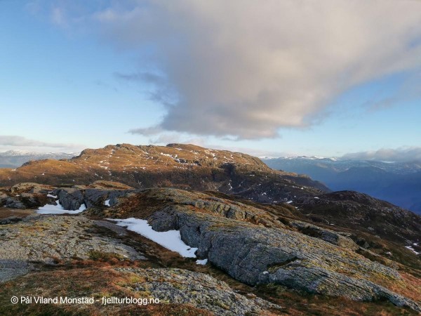 På hele turen hadde vi flott utsikt mot Skåneviksfjorden/Kvinnherad/ Sunnhordland i nord, og dalføret innover mot Stordalen i sør. I øst var Håfjellet en markant topp. Lett å plassere kjente fjelltopper med klare snøskiller. Ulvanosi i nord, Siggjo langt i vest og Hustveitsåta i sør, for å nevne noen få.