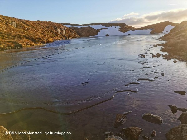 Enda et lite vann med is. Vi passerer utløpet på en liten demning.