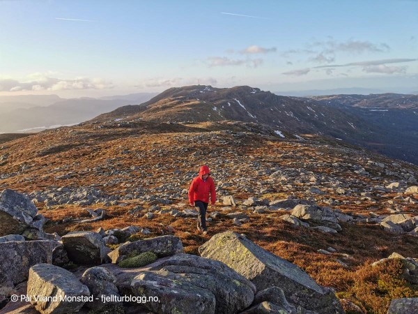 Turen østover mot målet var småkupert, i form av flere daler og småtopper. Likevel lettgått på vekselvis grasmark, berg og lav lyng. Det var dessuten et virvar av dyretråkk og stier, der i alle fall en del så ut til å ha retning målet.