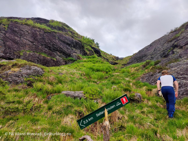 Merket sti mot Sellandsnuten. Litt myr i starten.