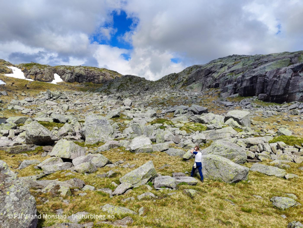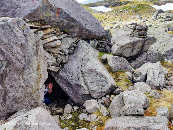 Vi fortsatte opp et nytt skar, nordvest for Krokavatnet. Ikke lange stykket det heller. Også her flatet det fint ut når vi kom over kanten. Flaten vest for Krokavassnuten var strødd med store og litt mindre store steiner. Skikkelig ur. Jeg hadde lest at det var her det skulle finnes en hidler ved navn Fantaståvå. Hvor den lå i steinlandskapet hadde jeg derimot ikke peiling på. Overraskelsen ble derfor stor da vi plutselig sto utenfor inngangen. Jeg hadde trodd den kanskje lå mer inntil foten av fjellet, men den lå altså ganske langt ute i røysa.