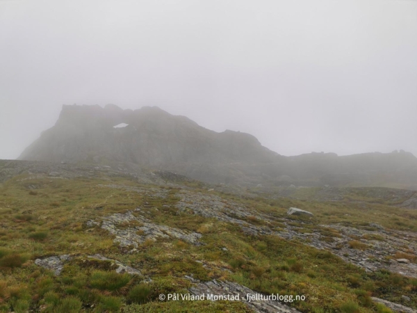 Vi holdt høyden stort sett helt bort til ura, før det gikk bratt opp siste stykket til toppen av skaret. Her tok vi av sekkene, og fulgte nødlinger videre mot toppen, som lå i skoddeheimen. Vi mistet nødlingene før toppen, men det var ikke vanskelig å finne fram. Varden var stor og flott. Det kan man derimot ikke si om dagens utsikt, som helt forsvant i skydekket.