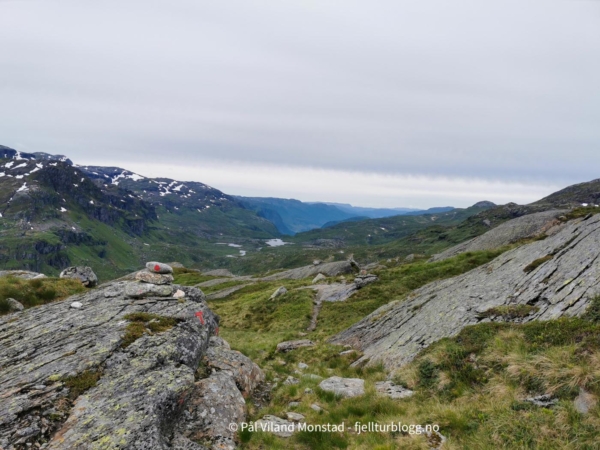 Etter en bedre middag med tilbehør og en god natts søvn, våkna vi til et langt bedre vær dagen etter. Vi fulgte T-stien tilbake til vestre ende av Nautavatnet. Denne dagen kunne vi virkelig nyte utsikten. Vi kunne se Blomstølen og Stordalen, og i sør tronet Skautanuten.