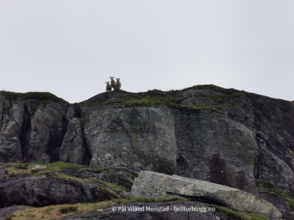 Vi gikk tilbake samme vei vi kom, tok på sekkene, og fortsatte opp motsatt side av skaret. Det gikk greit å komme opp til den mye mindre varden på toppen. Nedbøren vi hadde hatt med fra forrige topp gav seg, men ikke skydekket. Derfor ikke utsikt herfra heller.