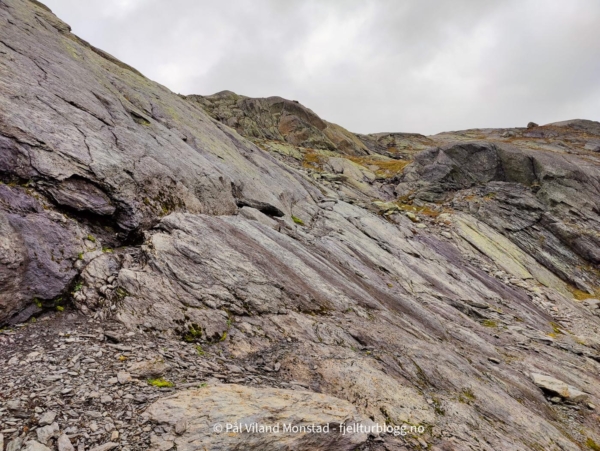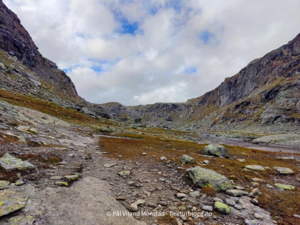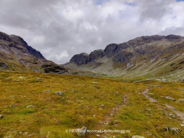 Det er ikke stigning å snakke om før man står helt innerst i dalen og lurer på hvordan man skal komme seg opp og over kanten. På avstand ser det håpløst bratt og uframkommelig ut, men stien slynger seg fint opp «endeveggen» i dalen. Stien videre til Middalsbu går innom varden på det som i grunnen ikke kan kalles en topp; Nupsredet 1362 moh. Kartverket opererer med navnet Nupsreet.