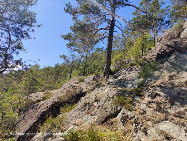 Etter et par hundre meter på denne, og så gjennom ei grind, kom jeg inn på en gulmerka sti. Denne fulgte jeg gjennom fin furuskog. Etter et stykke gikk det bratt ned til eidet mellom fastlandet og Øya. Jeg fant stien på andre siden, men valgte å forlate stien da jeg syntes stien tok feil retning. Jeg visste heller ikke om stien førte til toppen, eller kanskje bare ut på neset den gikk i retning av.