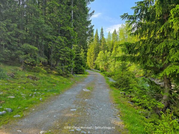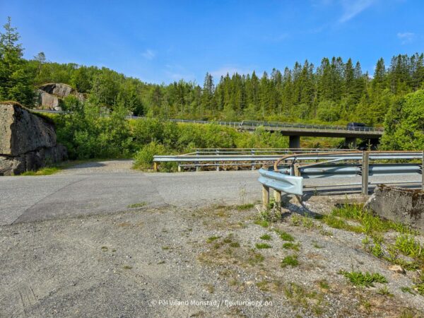 Bilen parkeres på gamleveien ved Vintertun, og turen starter på grusvei under brua.