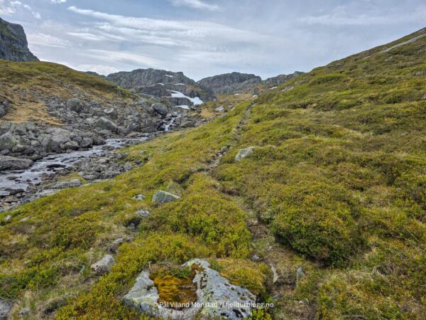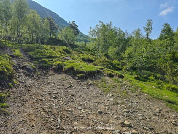 Veien gikk gradvis over til sti, og rett før Heimestølen var den bare delvis synlig i terrenget. Stien jeg fulgte videre var ikke den samme som den som er tegnet inn på kartet, som går mye nærmere elva. Mellom Heimestølen og Vintertunstølen fulgte jeg stien for langt i retning Botnabu, før jeg sjekket kartet og konstanterte at jeg var i litt feil retning.