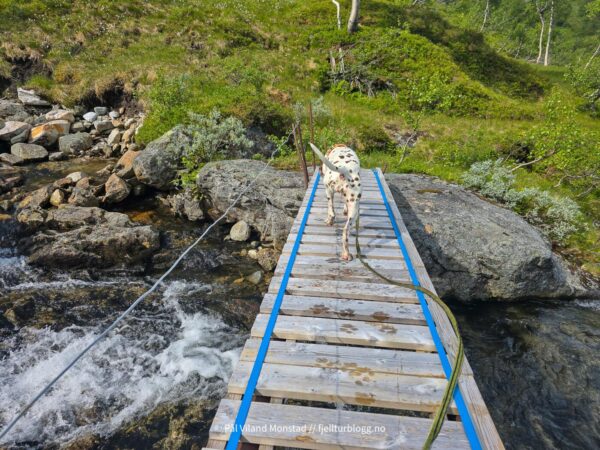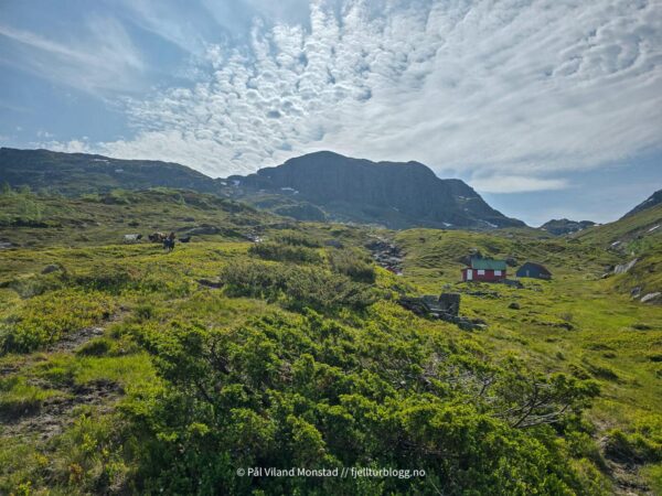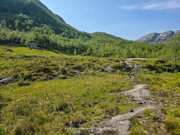 I vest mot DNT-hytta på Simlebu, som er godt synlig.