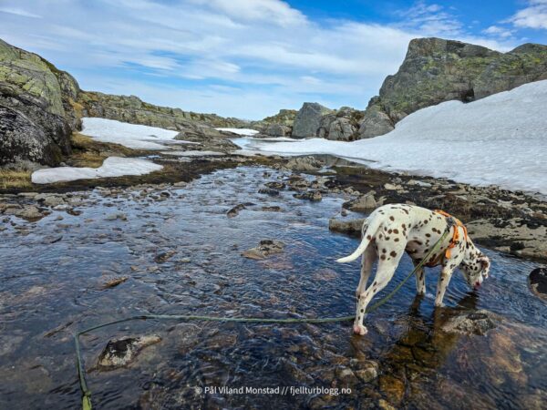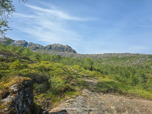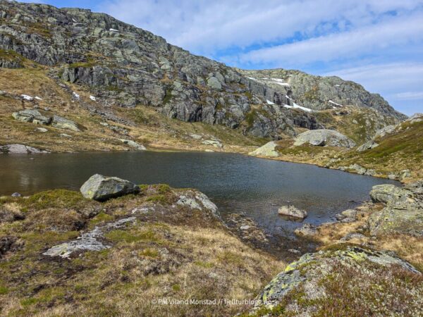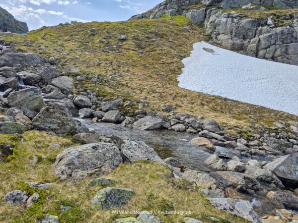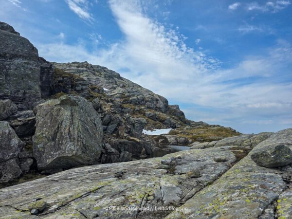 Oppe ved to små vann på ca høyde 940 var det på tide å forlate stien og ta kurs i retning toppen. Det var aldri store utfordringer med å finne farbar rute i noe mer sørvestlig og vestlig retning. Fra rundt 1000 moh var det noen smøfonner, men snøen bar godt og det var lett å ta seg over.