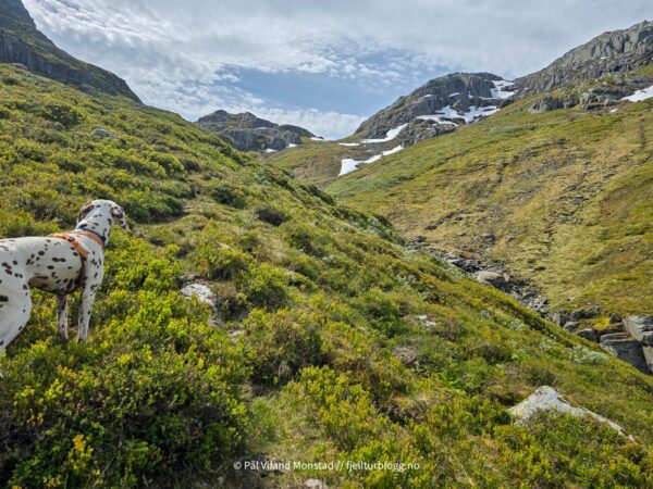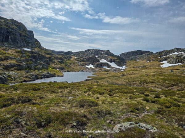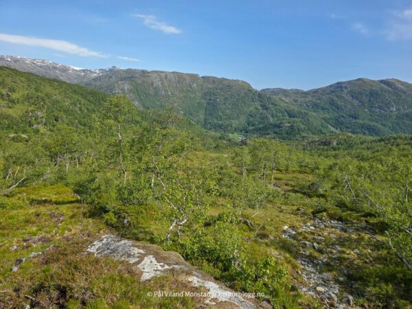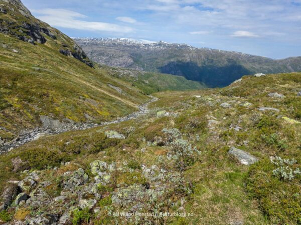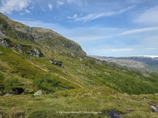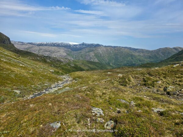 Etter hvert som jeg kom høyere opp i dalen ble det flott utsikt mot Folgefonna i nord. Selv på 900 moh var det spor etter kyr og kviger. Snakk om å ha det fint på sommerbeite!