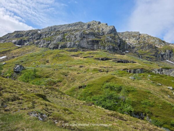 I skaret vest for punkt 1010 dreide jeg rett vest, og det gikk radig over svaene videre. Siste stykket opp til toppen var av det bratte slaget. Her kan det muligens være litt utfordrende hvis man ikke liker å forsere bratte berg og små skrenter.