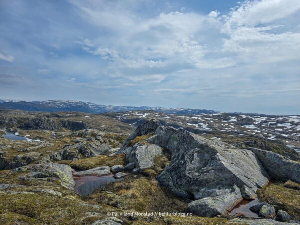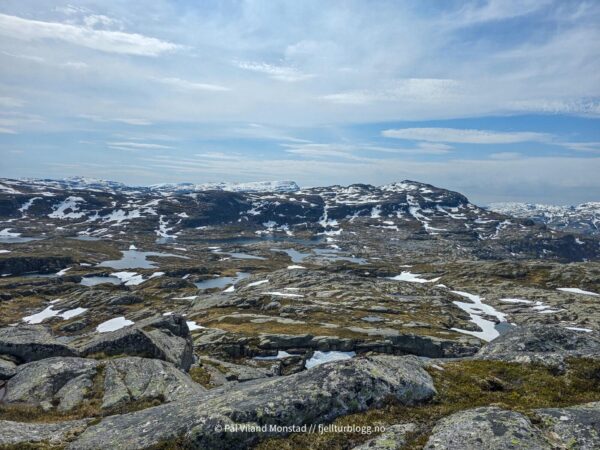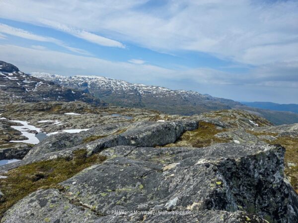 Jeg kom meg opp uten større problemer, og kunne konstantere at dette ikke var en topp med spesielt forseggjort varde. Bare noen mindre steiner på høyeste punkt. Utsikten var upåklagelig. I nord mot Folgefonna, og i sør Borddalsnuten, og lenger bak en ganske snødekt Kyrkjenut. Det var også lett å se hytta på Simlebu i vest.