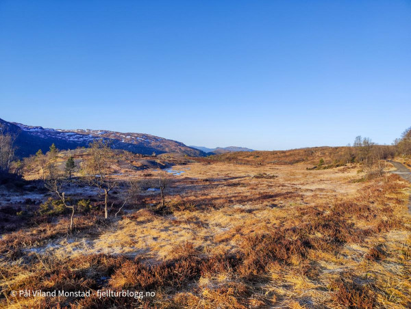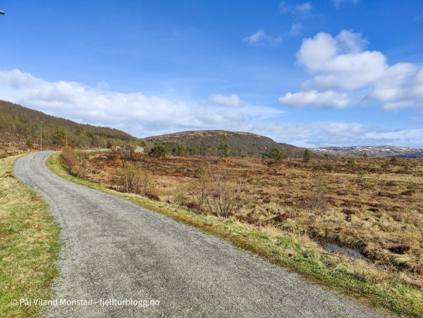 Turen starter på grusvei fra parkeringsplassen på Oppheim og innover mot Olalia.
