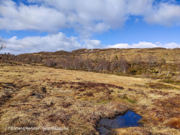 Det var en sur og kald vind i høyden, og det fristet lite å ligge oppe ved varden. Jeg tok derfor ned lia sør for toppen. Ganske bratt, men likevel ikke noen utfordringer nedover. Jeg endte opp nede på myra sør for Staurskorsnibbene. Her fant jeg noen fine berg, som alltid er greit å ligge inntil når man ligger i grevling (eller telt for den del). Det var også mindre vind, selv om det var ganske kaldt her og.