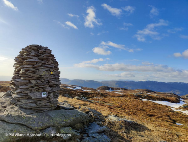 Turen gikk til Steinfjellet ved Olalia. Toppen ligger i Etne kommune, men turen startet fra Oppheim i Ølen. Jeg fulgte grusveien innover til nordenden av Ongelsvatnet. Her fant jeg stien som er inntegnet på kartet. Den var merket med gulmalte pinner og steiner, og ellers ganske tydelig i terrenget. Noe myr, men ganske lettgått. Ett bratt parti, før det igjen flatet ut mot toppen. På toppen var det en stor, flott varde. Steinfjellet ligger inne som «telltur», så det var bare å sjekke inn via Norgeskart Friluftsliv.