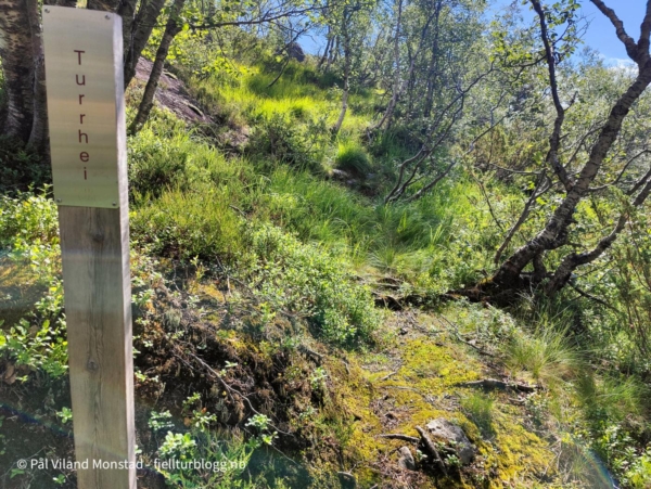 Turrhei er ingen høy eller markant topp. En liten knatt med rett over hundre høydemeter fra start til mål, men med fin utsikt fra toppen(e). Jeg besøkte først den vestre topppen, som hadde varde og en plankett som fortalte om et kunstprosjekt i 2009. Det var også noen merkinger som fortalte at løypa jeg fulgte var et kunstprosjekt. Hva dette prosjektet har vært er ikke godt å si. Kunst kan visstnok være det meste.