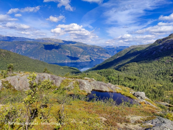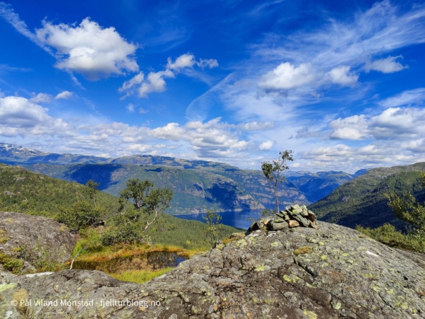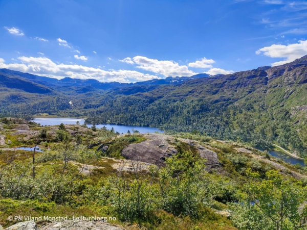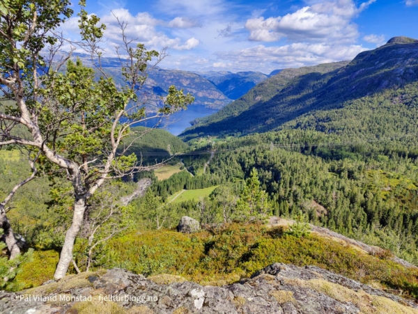 Utsikt ned mot Vetrhus og Suldalsvatnet.